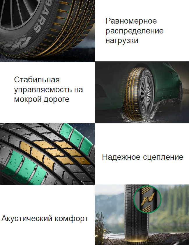 - Открытые поперечные канавки, приподнятое центральное ребро и усиленные плечевые зоны обеспечивают равномерное распределение нагрузки по всей поверхности протектора. Это улучшает устойчивость автомобиля и помогает шине изнашиваться более равномерно.