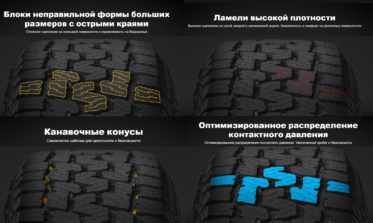 Самоочищаемость — система широких изогнутых канавок с рельефными кромками защищает от аквапланирования на скорости, а также препятствует застреванию камней между блоками.
